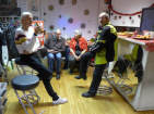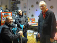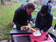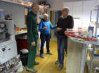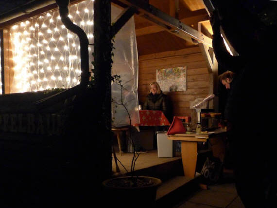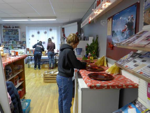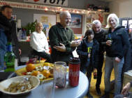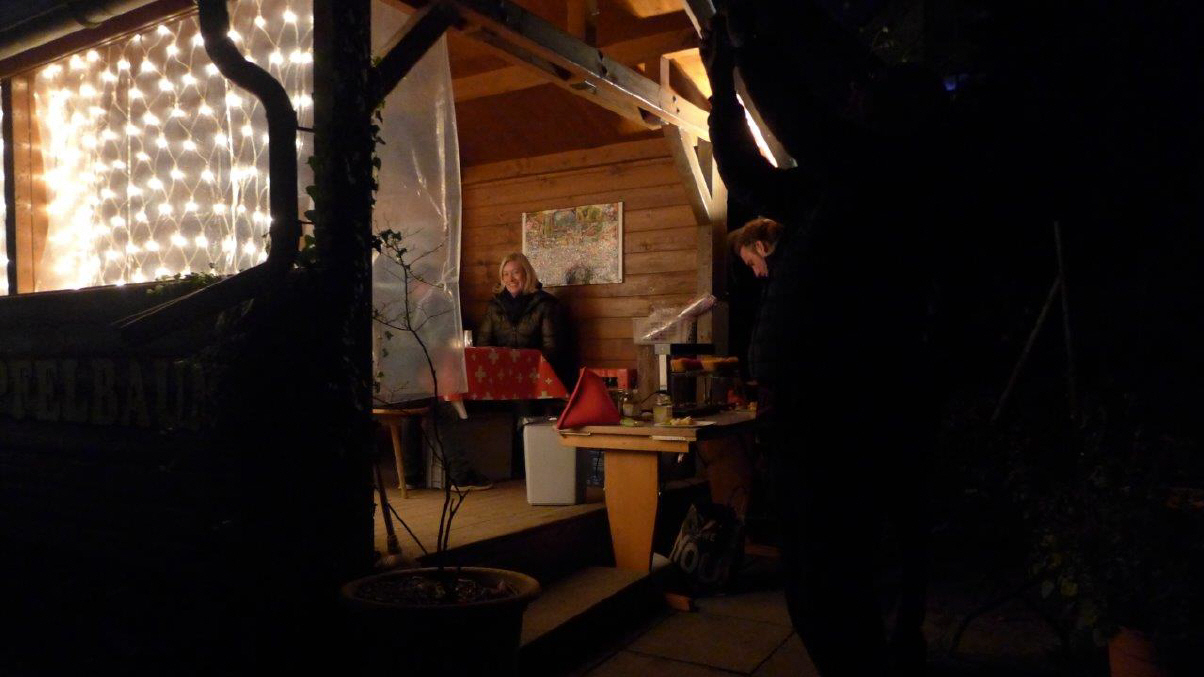Am zweiten Tag klappte es wie am Schnürchen: Mit dem Staubsauger musste ich den Dreck vom ersten Abend, der aus dem Schulgarten ins Lokal getragen wurde, erst wegmachen. Milly füllte all die Teller wieder auf mit Nüsschen, Clementinen und Süssigkeiten. Kurz nach 14 Uhr kamen die ersten Gäste und die Zeit verflog, schon bald gings rüber zum Raclett-Essen, Romeo und sein Vater Peter waren ein eingespieltes Team. Auch wenn mit 22 Personen mehr Gäste da waren, so schnell wie am Vorabend verkleinerten sich die Käsehälften nicht und es blieb zum Schluss mehr übrig. Dafür war im Lokal mehr los und einige deckten sich mit Material ein.