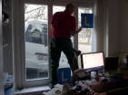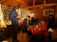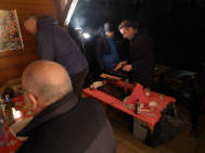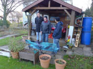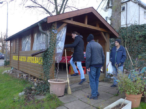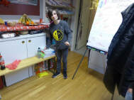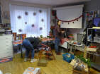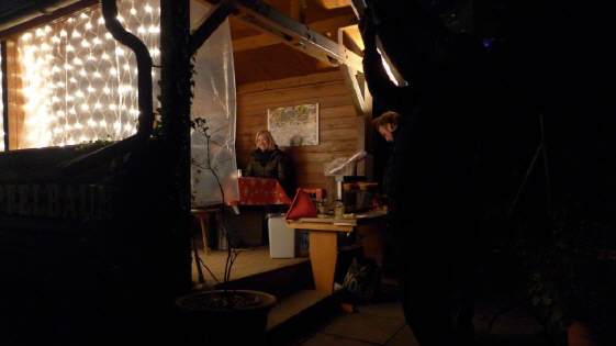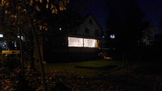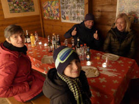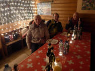Milena und Peter, später unter Mithilfe von Gregor, machten sich daran, die Blockhütte vis-à-vis im Schulgarten herzurichten. Leider verpasste ich es, Fotos davon zu machen. Denn in der Zwischenzeit hatte ich alle Hände zu tun, Gabriela und Alexandra anzuweisen, wie sie das Lokal dekorieren sollten. Sie machten sich fleissig ans Werk, später halfen auch noch Milena und Peter mit. Gregors Aufgabe war insbesondere, den Korridor zu beleuchten, da anlässlich der Einladung der Zugang über die Haustüre und das Treppenhaus erfolgt. Würde die Türe ständig auf und zu gehen, wäre der Wärmeverlust zu hoch. |