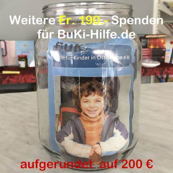 Die BuKi-Spenden am zweiten Abend beliefen sich auf 170 Franken, hernach gingen aber noch mehr Beträge ein von Besuchern am DO und FR, so dass sich dieser Betrag um weitere 160 Franken erhöhte, vielen, vielen Dank! |