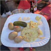 Der zweite Tag profitierte von der Routine: Alles war da, wo es gebraucht wurde! Auch die Kartoffeln, Gina sei Dank, waren diesmal zur Stelle, als sich die ersten in der Reihe für Raclette anstellten. Die Gäste, auch einige unerwartete, die ich seit Jahrzehnten nicht mehr gesehen hatte, wollten sich diese letzte Chance nicht entgehen lassen. |