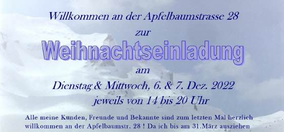 Alternative WEIHNACHTSEINLADUNG 2021 in der Zeit von Dienstag, 7.Dez. bis Freitag, 17.Dez. bin ich jeweils in der Zeit von 10-18 Uhr an der Apfelbaumstrasse 28 für Einzelbesuche zur Verfügung!