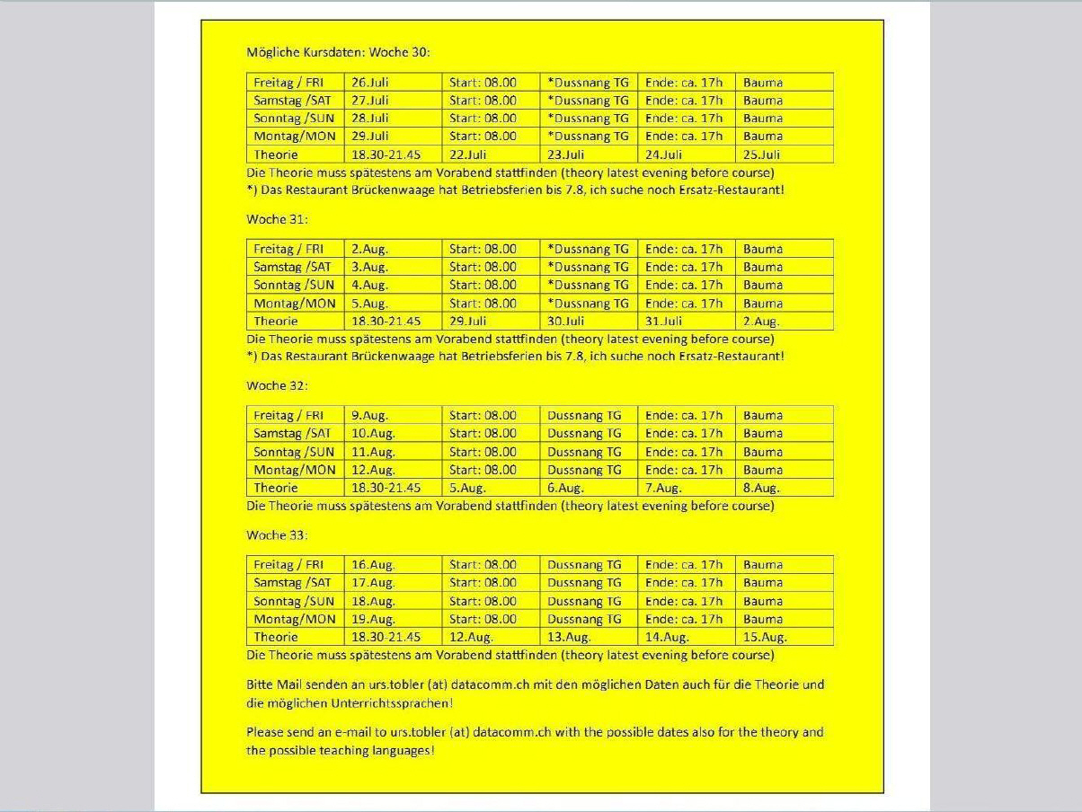 Bitte E-Mail an urs.tobler (at) datacomm.ch für Teilnahme an einem WB-Kurs, für KT2 und WB-Kurs Interlaken das Datum wählen. Für KT1 bitte abgeben, ob im April, Mai oder Juni (samstags, ev. sonntags) |