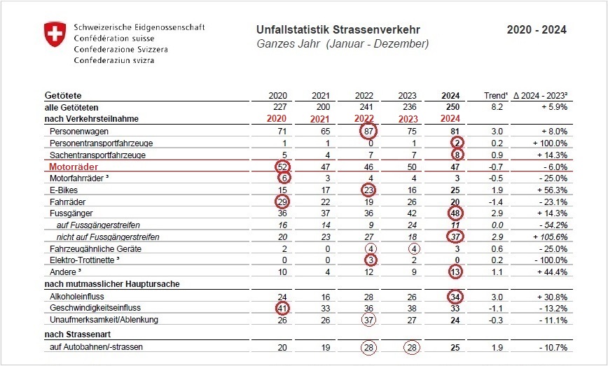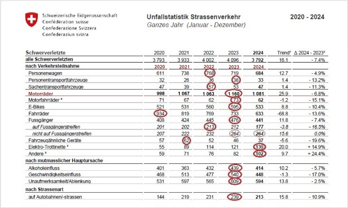 Strassenverkehrsunfälle 2024: Die Zahlen (Vergleich 2020-2024) als PDF [100 KB]