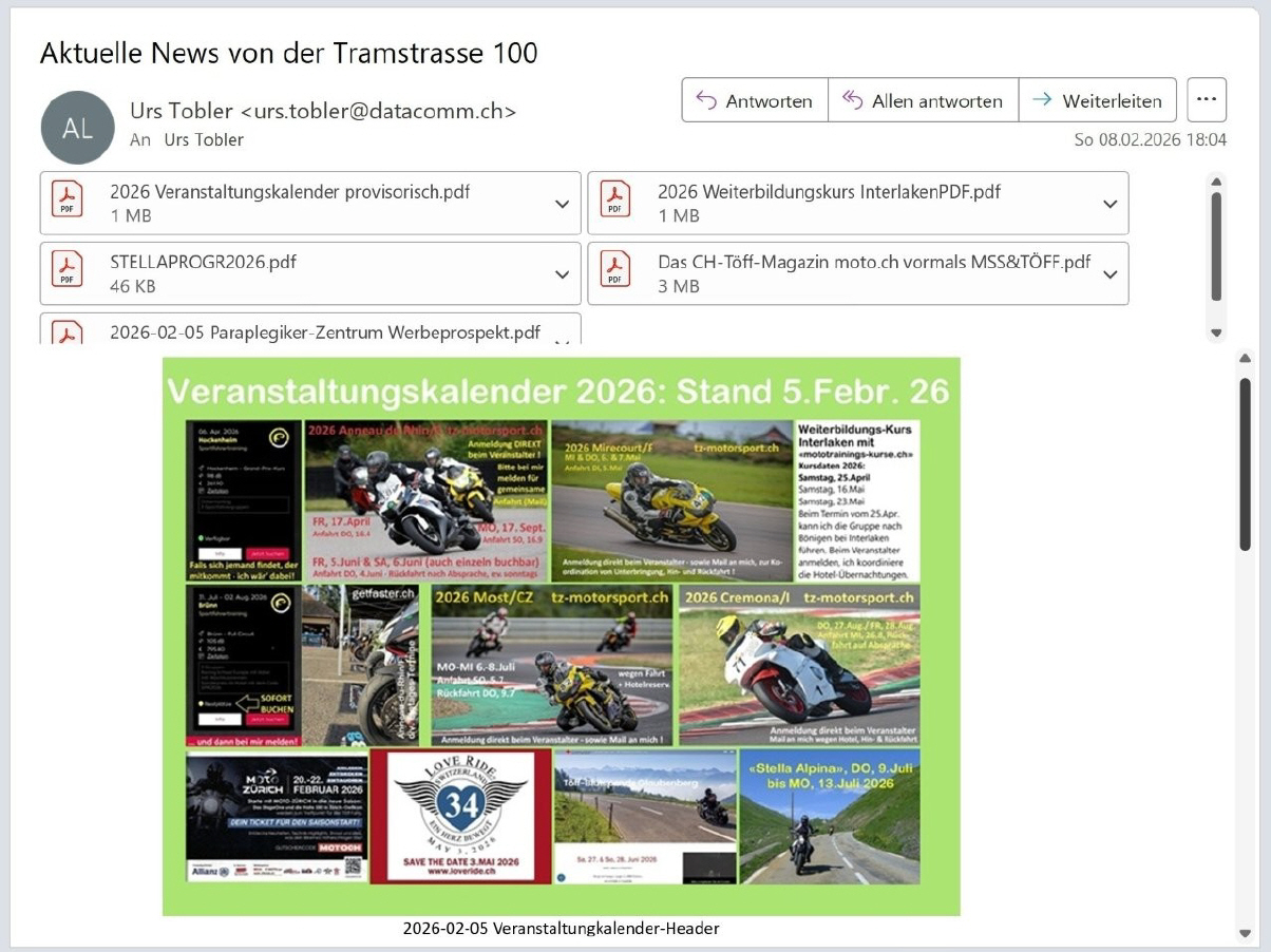 Dieses E-Mail ging ENDLICH am Sonntag, 8.Febr. 2026 raus. Eigentlich hätte es schon am 5.Febr. abgesandt werden sollen, aber inzwischen konnte ich für die «MotoZürich» noch eine Verbilligung von 20% organisieren auf Online-Tickets, die vor dem 12.Febr. gelöst werden! Also nicht zögern, zupacken!