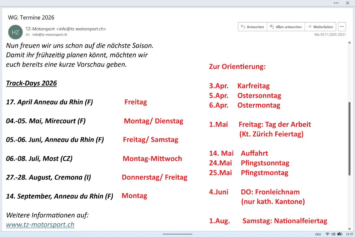Geplante tz-motorsport.ch-Veranstaltungen |