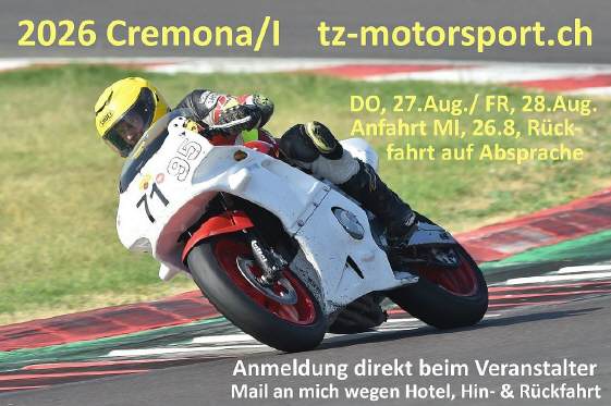 Auch Cremona/I ist eine von mir bevorzugte Rennstrecke und mit gut 4 Stunden Anfahrzeit noch relativ nahe gelegen. Zu diesem Anlass bestehen noch keine Anmeldungen, doch wenn sich mindestens noch jemand (neben mir) meldet, dann würde ich extra dafür frei nehmen. Mit dem Veranstalter getfaster.ch gäbe es als Alternative die Möglichkeit, in den Sommerferien den Termin vom 14./15.Aug. zu besuchen. Die Anfahrt müsste am Nachmittag des DO, 13.Aug., die Rückfahrt dann am SO, 16.Aug. stattfinden. Das wären dann 3 Hotelübernachtungen.