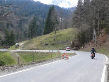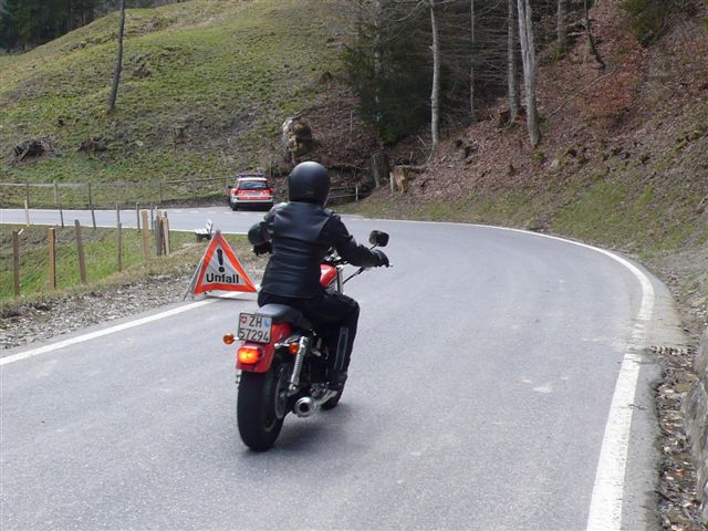 Eine herrliche Gegend, wunderbare geschwungene Kurven, gut ausgebaute Spitzkehren, eher wie Wendeplatten – alles was das Motorradfahrer-Herz begehrt: Dann plötzlich sticht mir in einer langgezogenen, unübersichtlichen Linkskurve auf meiner Strassenseite ein Sportfahrer entgegen und kann im letzten Moment noch auf seine Seite zurück. Klopf, klopf – ganz schöner Stress für den Moment. |