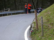Der Töff-Fahrer war wohl von der Ambulanz bereits abgeholt worden. So wie die Spuren lagen, hat der verunfallte 125er-Pilot eingangs der Kurve gebremst, was ihn in Richtung der Leitplanke fahren liess: Mit einer Blockierbremsung rutschte er stürzend in den Pfosten der Leitplanke, wo die Vordergabel völlig ins Fahrzeug gestaucht wurde. Die Nummer lag neben dem Töff: SZ 22221 - ein Plakat von Töff-Nummer, jetzt ein berühmtes Plakat.... |