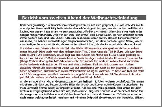 An dieser Stelle möchte ich mich bei allen bedanken, die mich das ganze Jahr über mit Geschenken und Dankeskarten, persönlichem Dank oder per E-Mail reich bedacht haben: Es ist schön, zu spüren, dass mein Einsatz von vielen geschätzt wird. Denn der grosse Einsatz bedeutet für Sigrid oft viel Verzicht, aber im Winter bekommt sie (glaube ich zumindest) genug von mir. Das ist halt, wenn man mit jemandem zusammen ist, der seinen Beruf lebt: «Töff, Töff – nüt als Töff!»