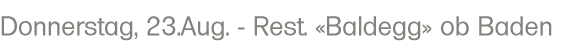 Diesmal findet die Ausfahrt bei warmem Wetter, aber wahrscheinlich nicht ganz ohne Gewitter-Risiko statt: So starten wir einmal mehr zu einer SPEZIAL-DO-Ausfahrt mit zwei Abfahrtszeiten an der Tramstrasse 109, um 18.00 und um 19.00 Uhr und zusätzlich um 18.30 Uhr mit Alain auf der Waldegg. Unser Ziel liegt aufgrund der Wetter-Situation im Westen: Da ist das Regen- und Gewitter-Risiko am geringsten. Wir besuchen einmal mehr das Rest. Baldegg oberhalb von Baden mit einer herrlichen Rundsicht. Die Rückfahrt geht über die Autobahn und ist ultra-schnell, weniger als eine halbe Stunde. |