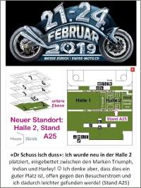 Auch in diesem Jahr werde ich wieder einen eigenen Stand haben: Da die Halle 3 neu aufgeteilt werden musste (Ofrag mit den Marken Piaggio, Aprilia hat neu auch noch Moto Guzzi im Angebot), musste ich weichen. Ich denke aber, dass der neue Standort in der Halle 2 für mich ein guter Platz sein wird, auch wenn die Umgebung mit den Marken Triumph, Indian und Harley im Rücken etwas seltsam ist für meine Fahrschule: All diese Maschinen, mit Ausnahme weniger Triumph-Modelle, sind eher etwas für Könner denn für Anfänger! ;-) |