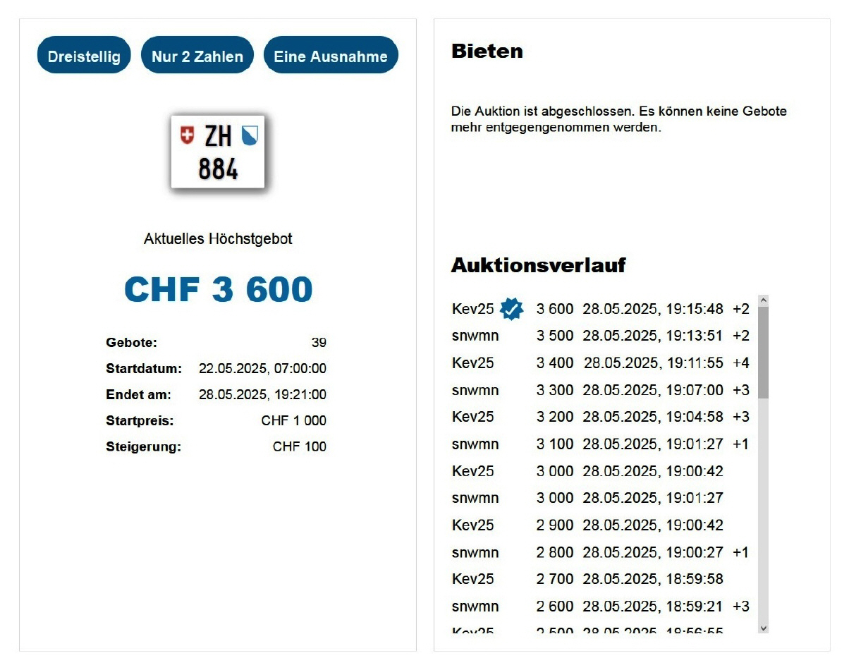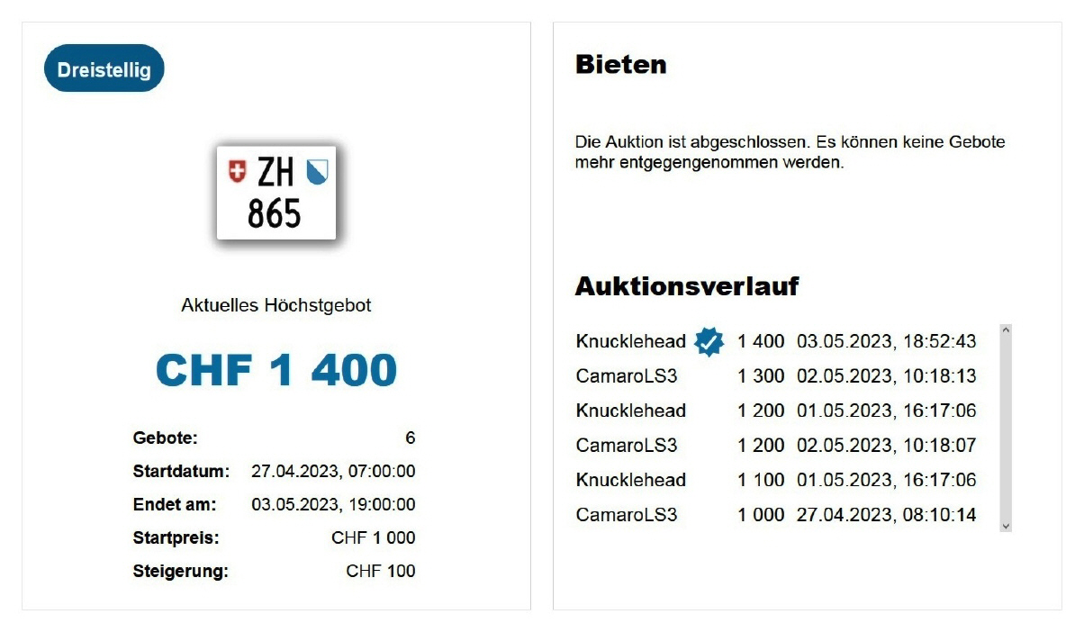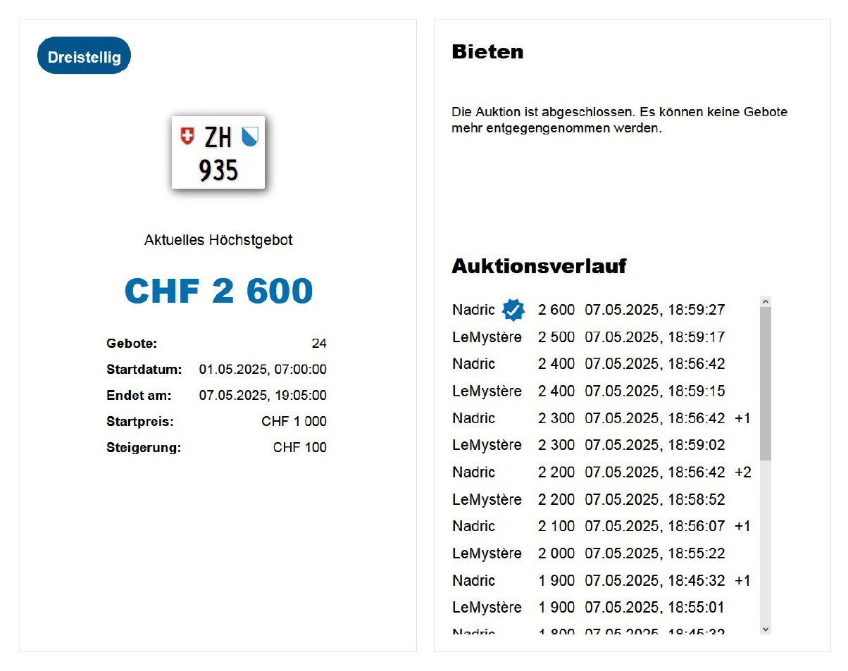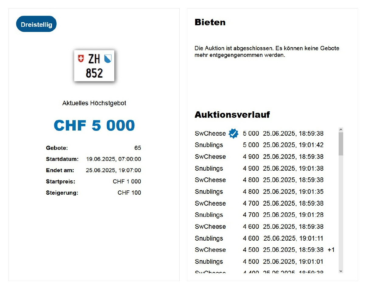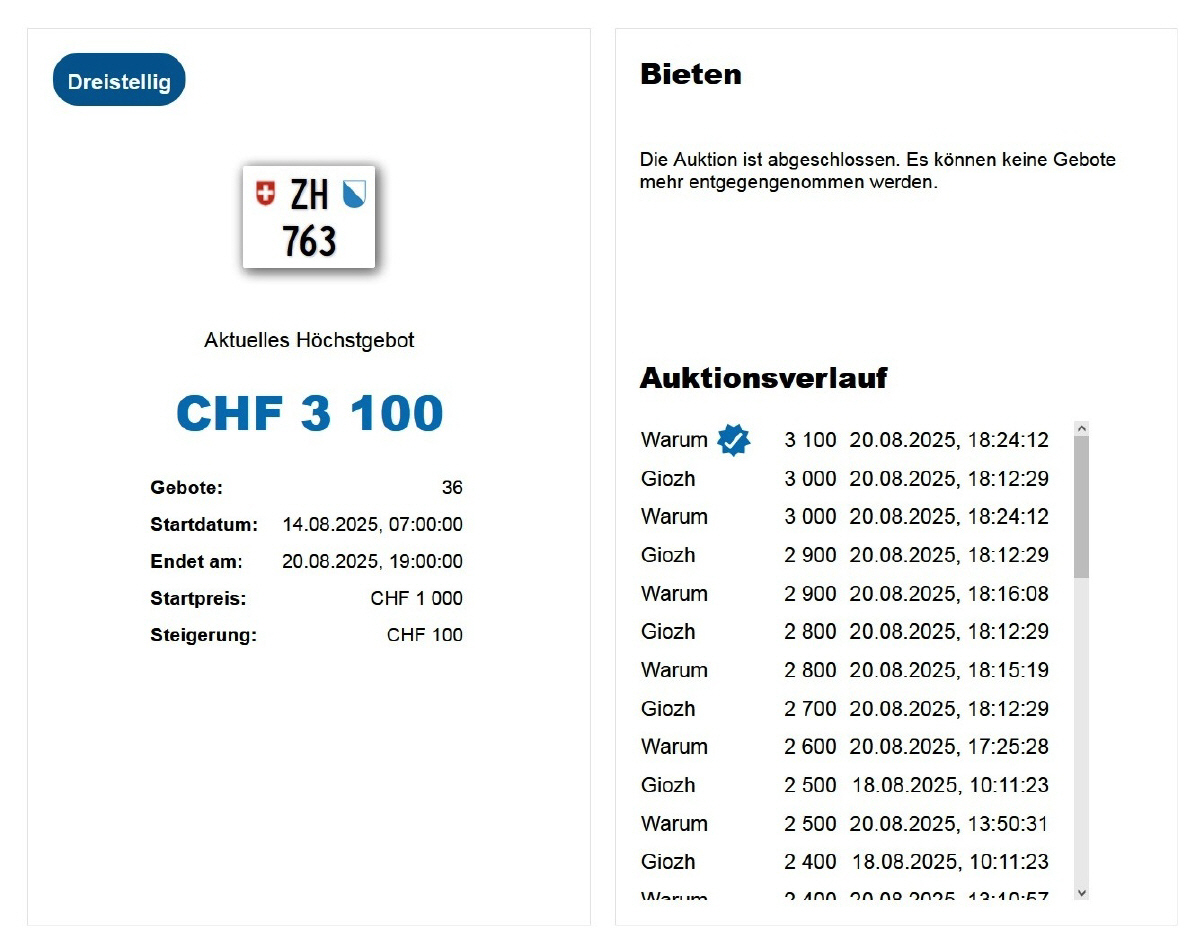 Am 25.11.2020 wurde im Kanton Zürich das 3-stellige TÖFF-Nummernschild ausgegeben - in der Auktion ging es für Fr. 4000.- weg: Auch hier boten sich zwei Bieter hoch! Verfolge den Verlauf vom «ZH 701
