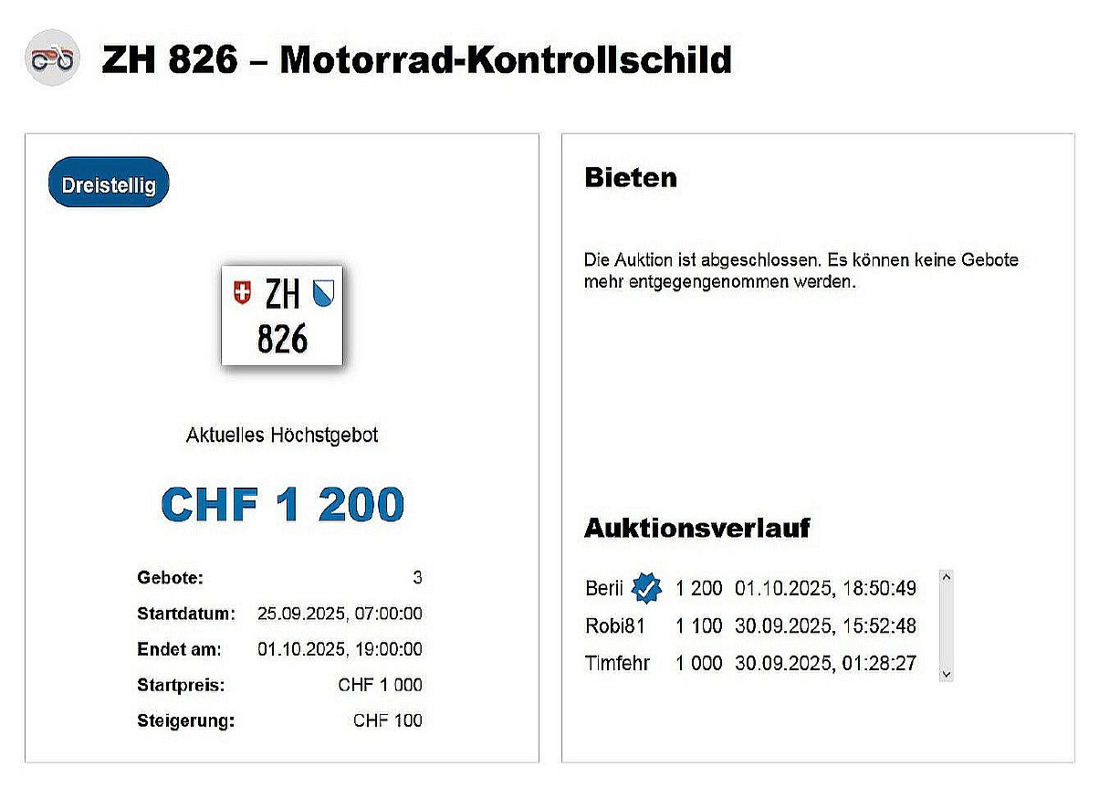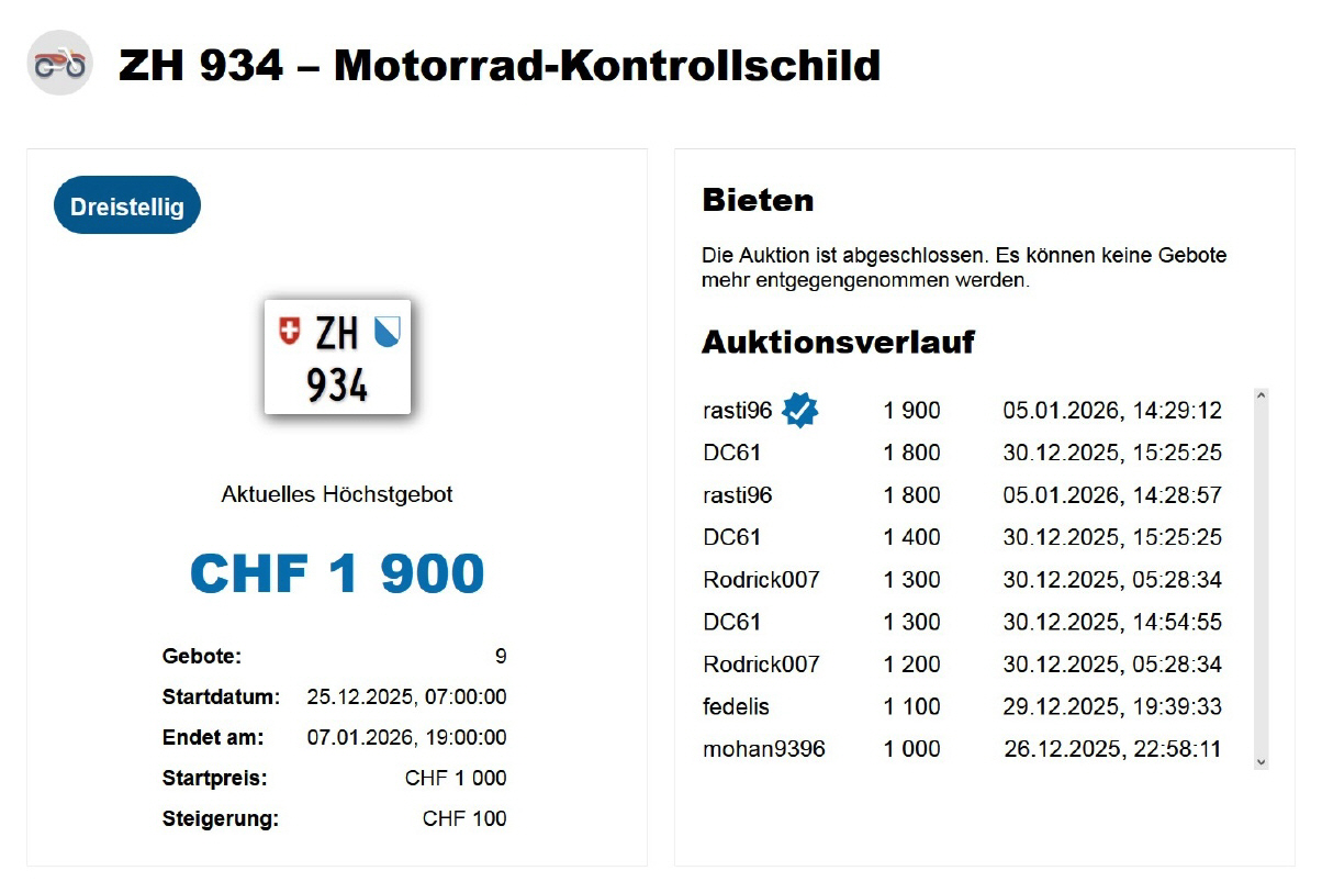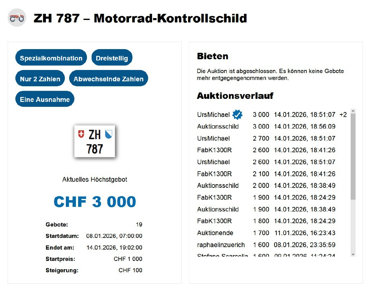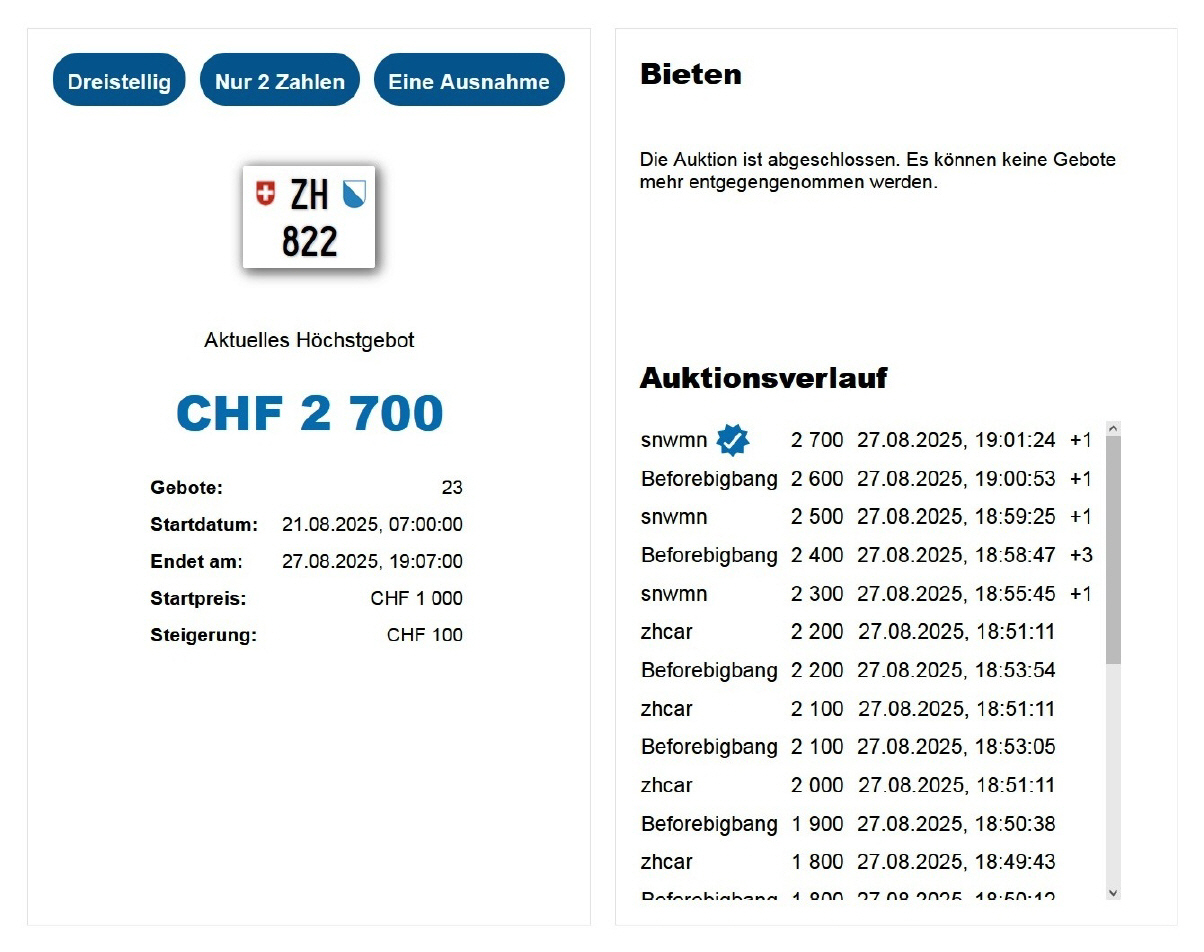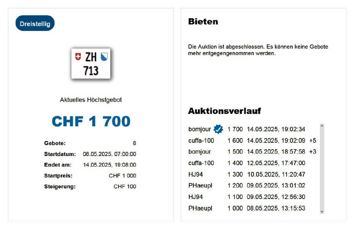 Am 25.11.2020 wurde im Kanton Zürich das 3-stellige TÖFF-Nummernschild ausgegeben - in der Auktion ging es für Fr. 4000.- weg: Auch hier boten sich zwei Bieter hoch! Verfolge den Verlauf vom «ZH 701