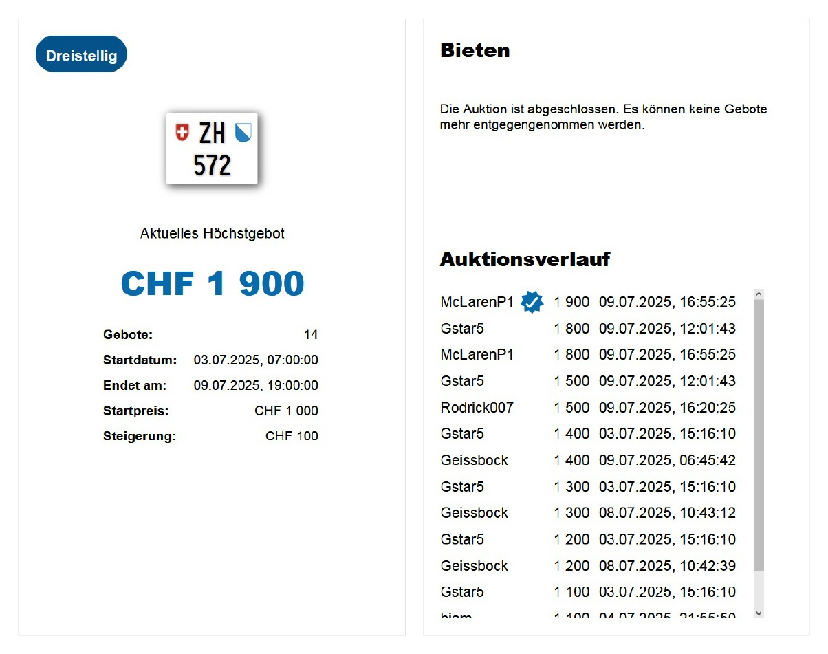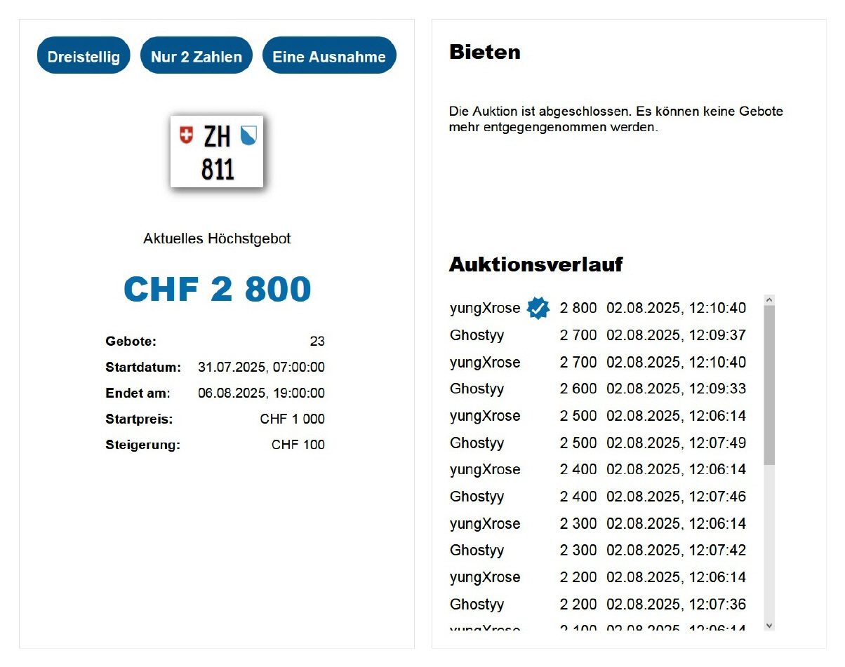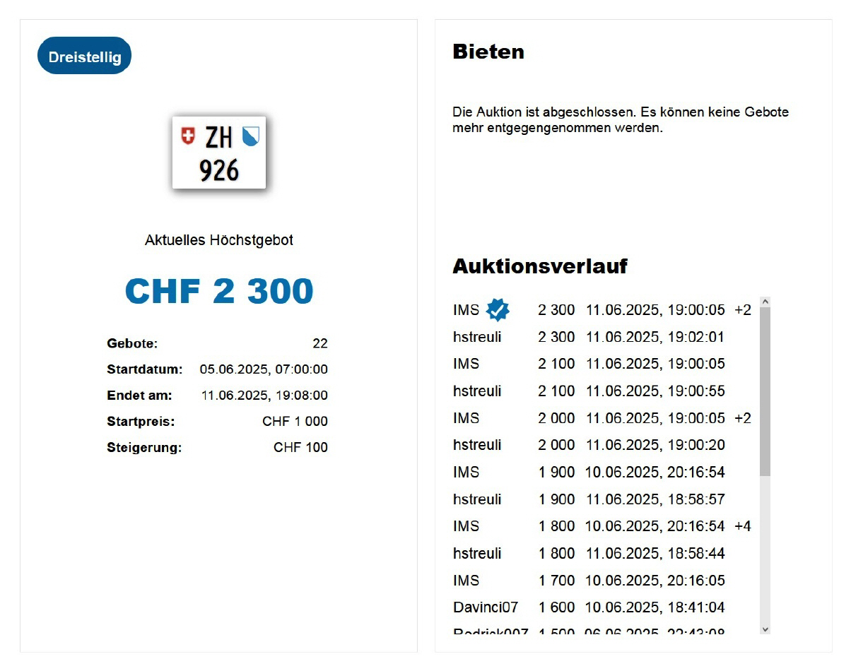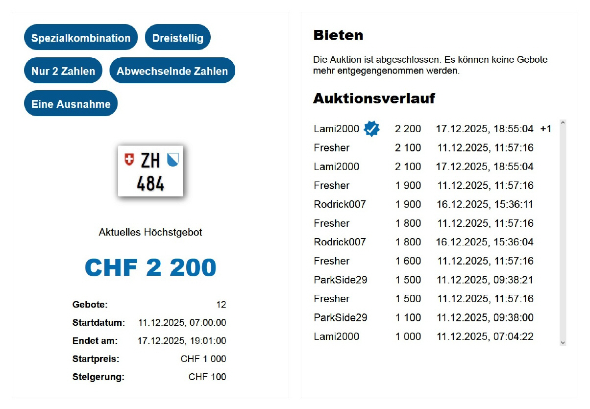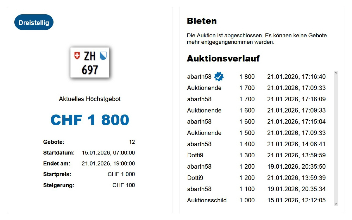 Am 25.11.2020 wurde im Kanton Zürich das 3-stellige TÖFF-Nummernschild ausgegeben - in der Auktion ging es für Fr. 4000.- weg: Auch hier boten sich zwei Bieter hoch! Verfolge den Verlauf vom «ZH 701