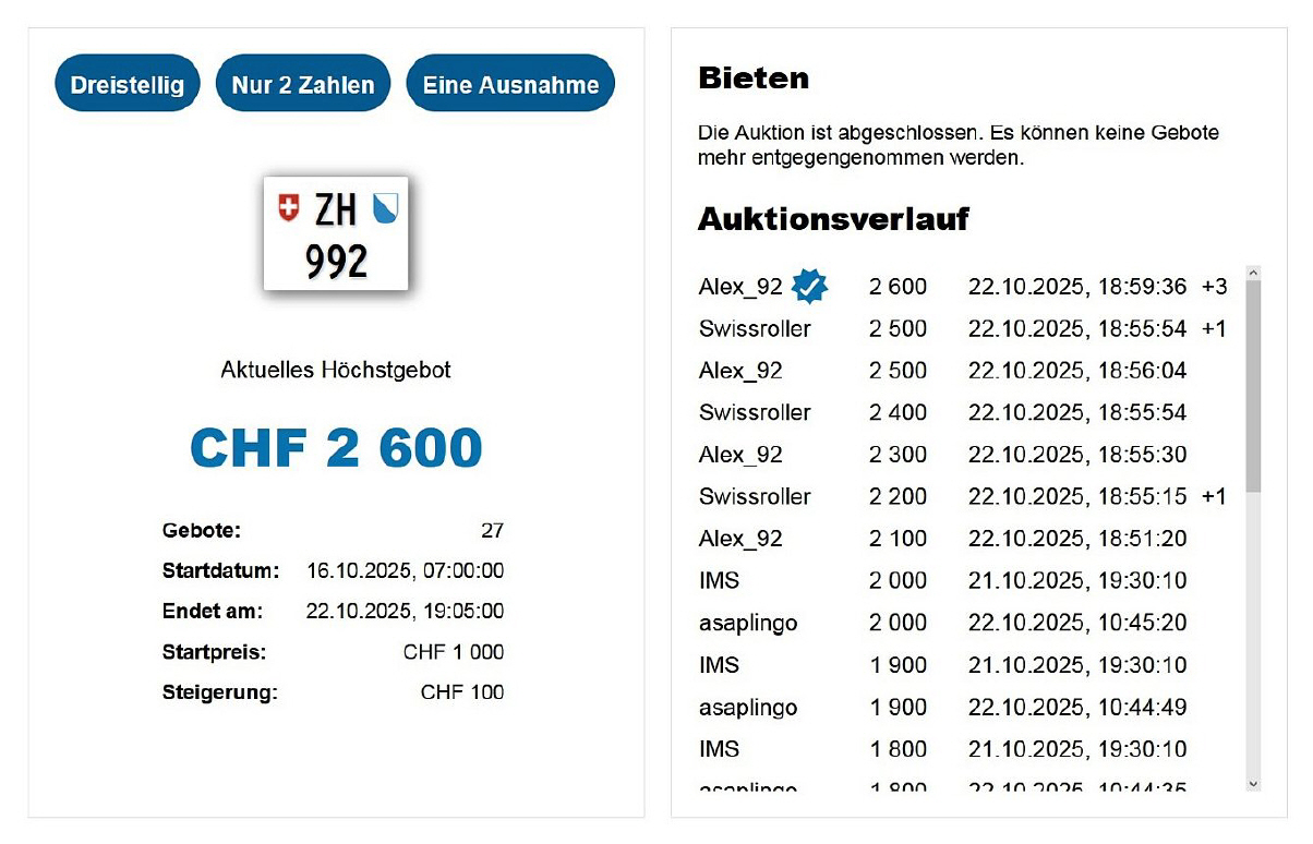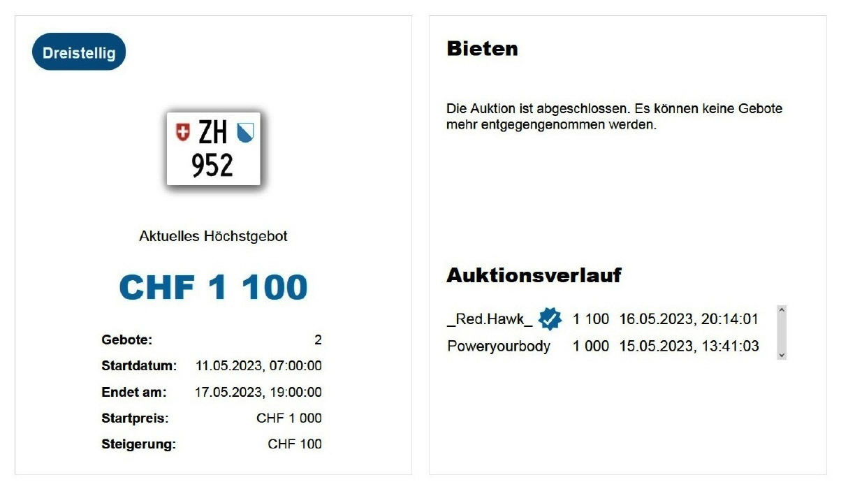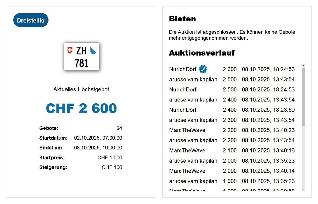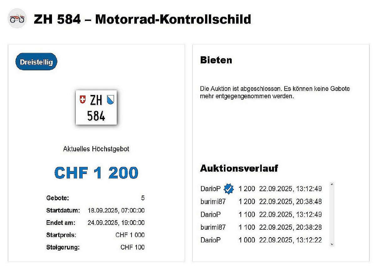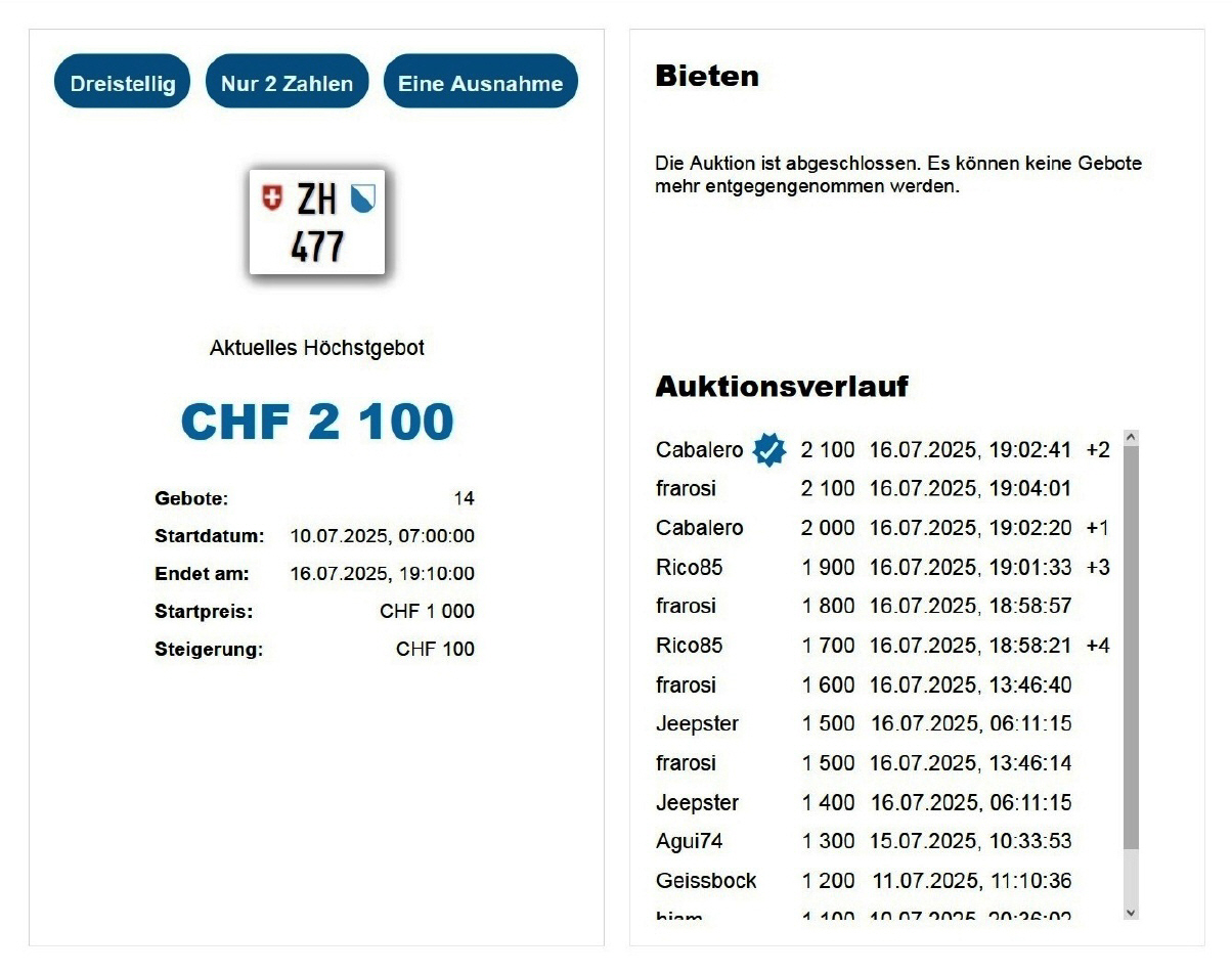 Am 25.11.2020 wurde im Kanton Zürich das 3-stellige TÖFF-Nummernschild ausgegeben - in der Auktion ging es für Fr. 4000.- weg: Auch hier boten sich zwei Bieter hoch! Verfolge den Verlauf vom «ZH 701