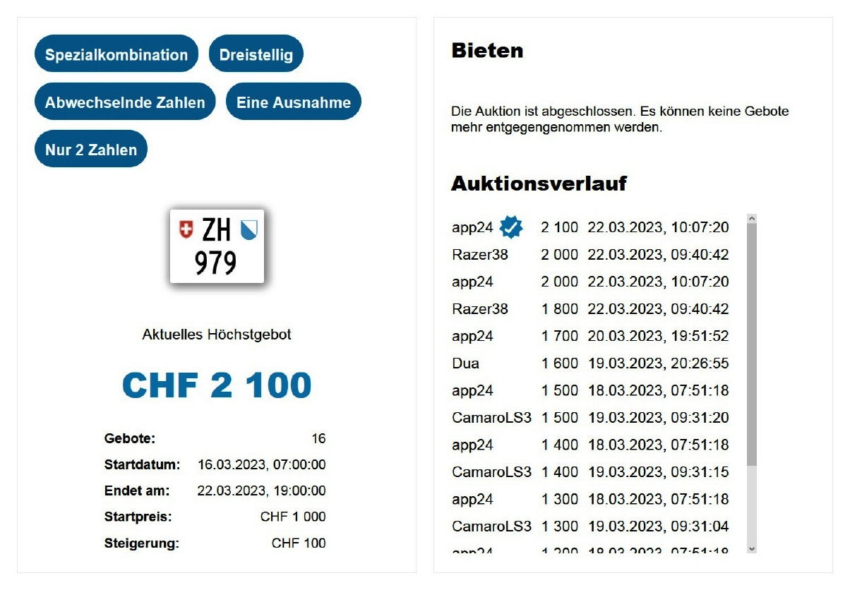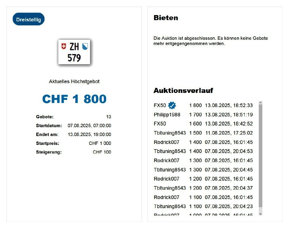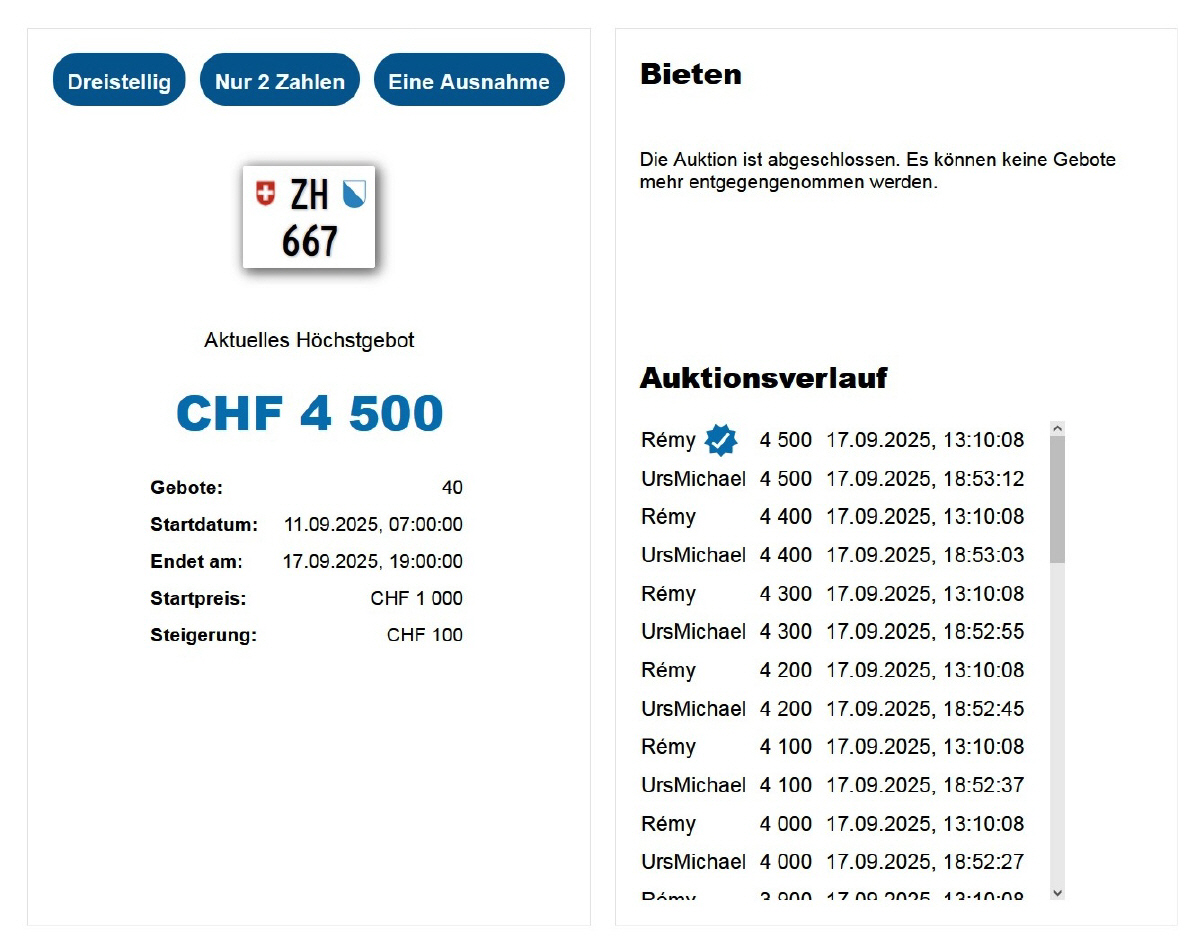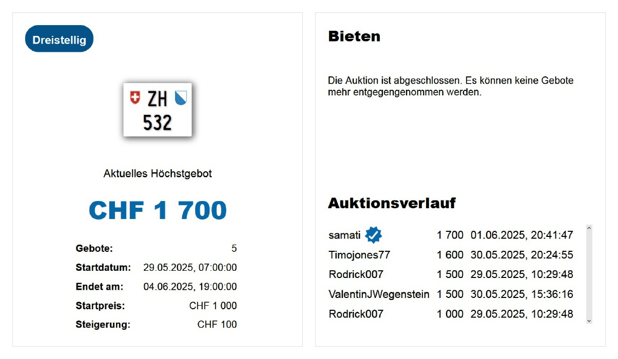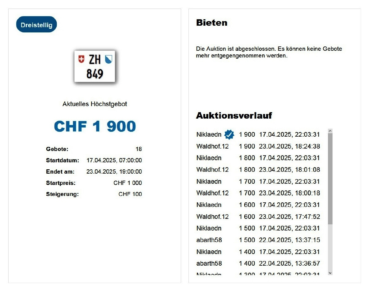Am 25.11.2020 wurde im Kanton Zürich das 3-stellige TÖFF-Nummernschild ausgegeben - in der Auktion ging es für Fr. 4000.- weg: Auch hier boten sich zwei Bieter hoch! Verfolge den Verlauf vom «ZH 701