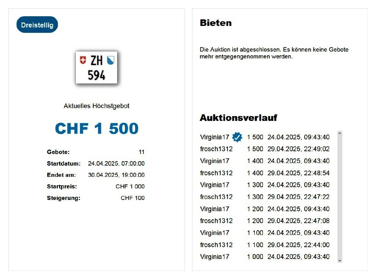 Am 30.04.2025 wurde im Kanton Zürich das nächste 3-stellige TÖFF-Nummernschild ausgegeben - in der Auktion ging es zum tiefen Preis von Fr. 1500.- weg! Verfolge den Verlauf vom «ZH 594