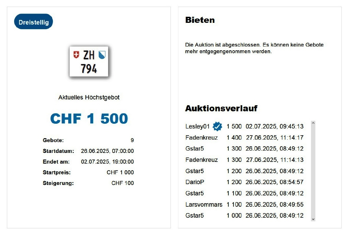 Am 02.07.2025 wurde im Kanton Zürich das nächste 3-stellige TÖFF-Nummernschild ausgegeben - in der Auktion ging es zum äusserst tiefen Preis von nur Fr. 1500.- weg! Verfolge den Verlauf vom «ZH 794
