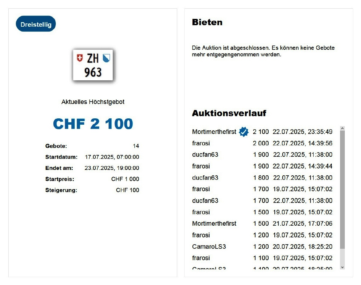 Am 23.07.2025 wurde im Kanton Zürich das nächste 3-stellige TÖFF-Nummernschild ausgegeben - in der Auktion ging es zum günstigen Preis von Fr. 2100.- weg! Verfolge den Verlauf vom «ZH 963