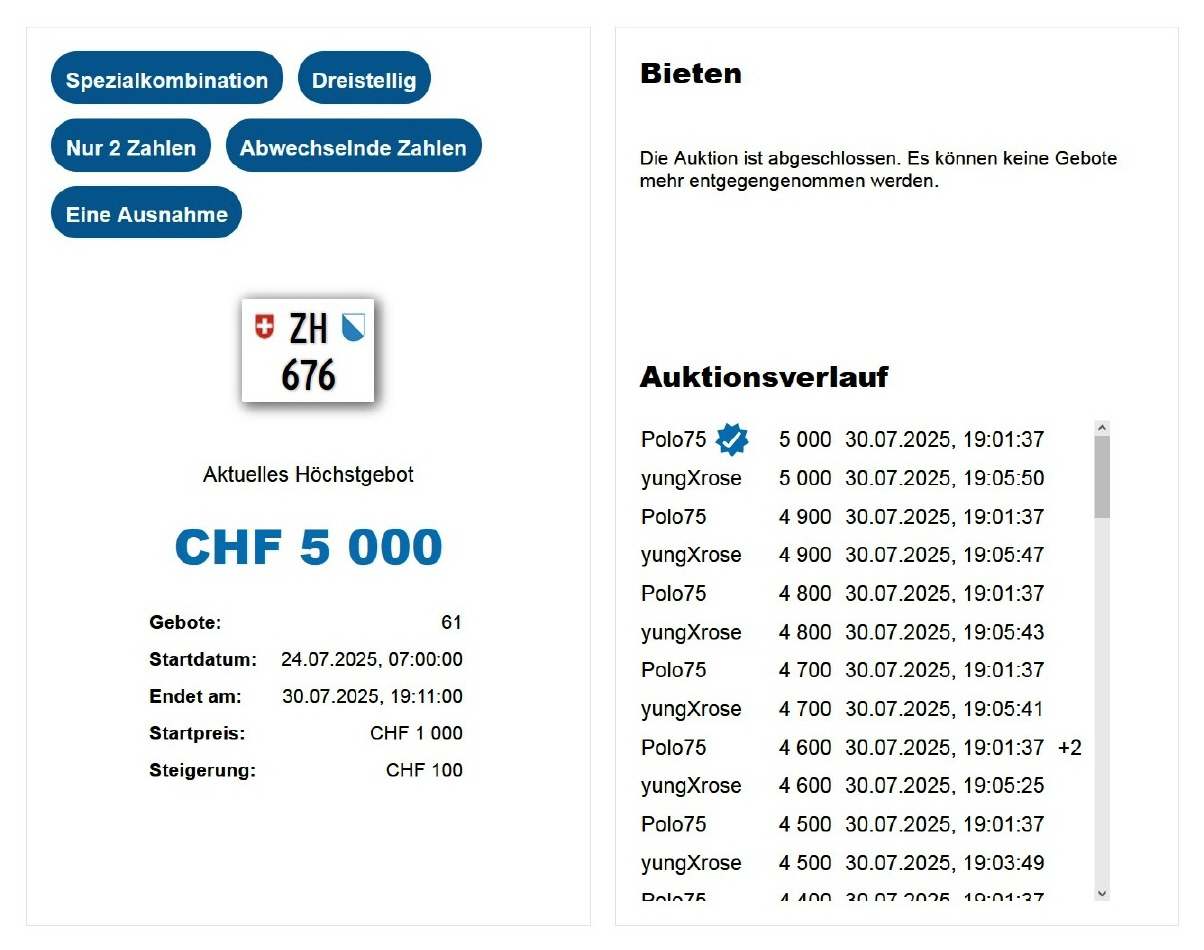 Am 30.07.2025 wurde im Kanton Zürich das nächste 3-stellige TÖFF-Nummernschild ausgegeben - in der Auktion ging es zum sensationellen Preis von Fr. 5000.- weg! Verfolge den Verlauf vom «ZH 676