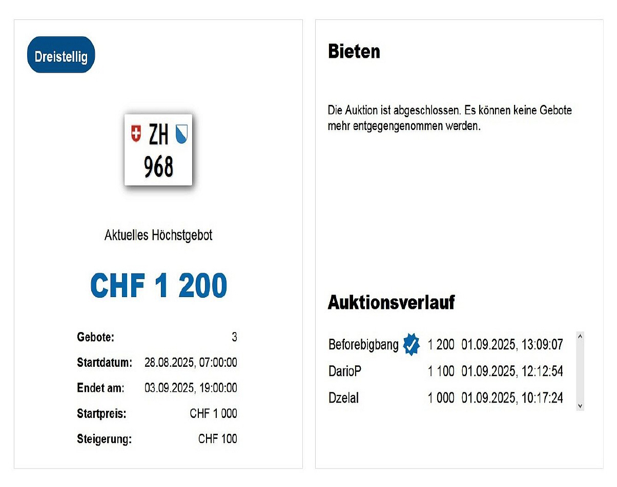 Am 03.09.2025 wurde im Kanton Zürich das nächste 3-stellige TÖFF-Nummernschild ausgegeben - in der Auktion ging es zum sensationell tiefen Preis von nur Fr. 1200.- weg! Verfolge den Verlauf vom «ZH 968