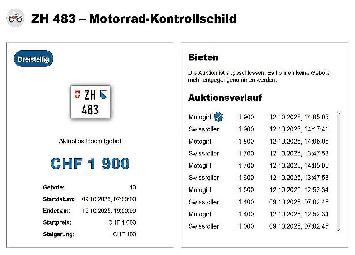 Am 15.10.2025 wurde im Kanton Zürich das nächste 3-stellige TÖFF-Nummernschild ausgegeben - in der Auktion ging es zum relativ günstigen Preis von nur Fr. 1900.- weg! Verfolge den Verlauf vom «ZH 483