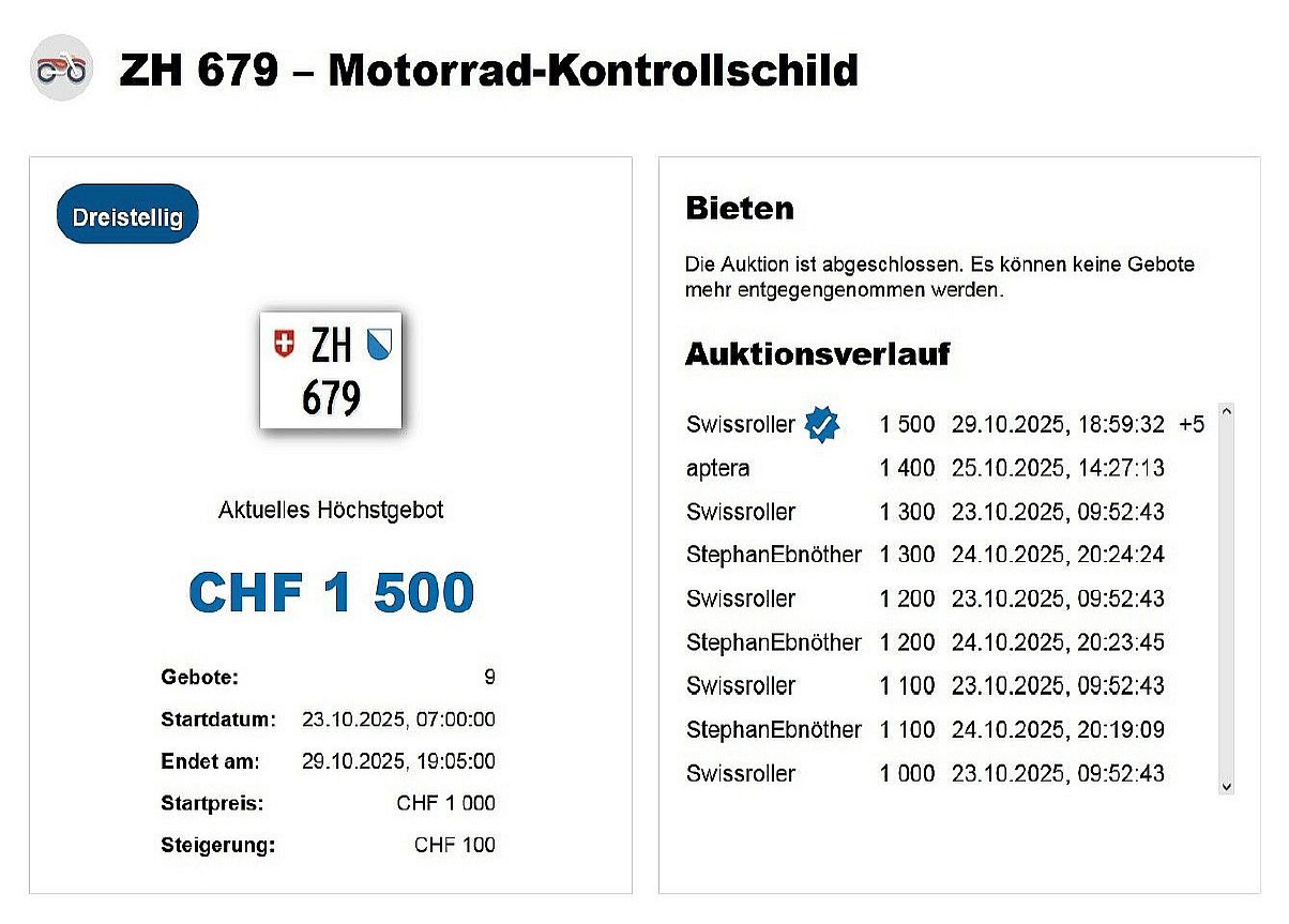 Am 29.10.2025 wurde im Kanton Zürich das nächste 3-stellige TÖFF-Nummernschild ausgegeben - in der Auktion ging es zum äusserst tiefen Preis von nur Fr. 1500.- weg! Verfolge den Verlauf vom «ZH 679