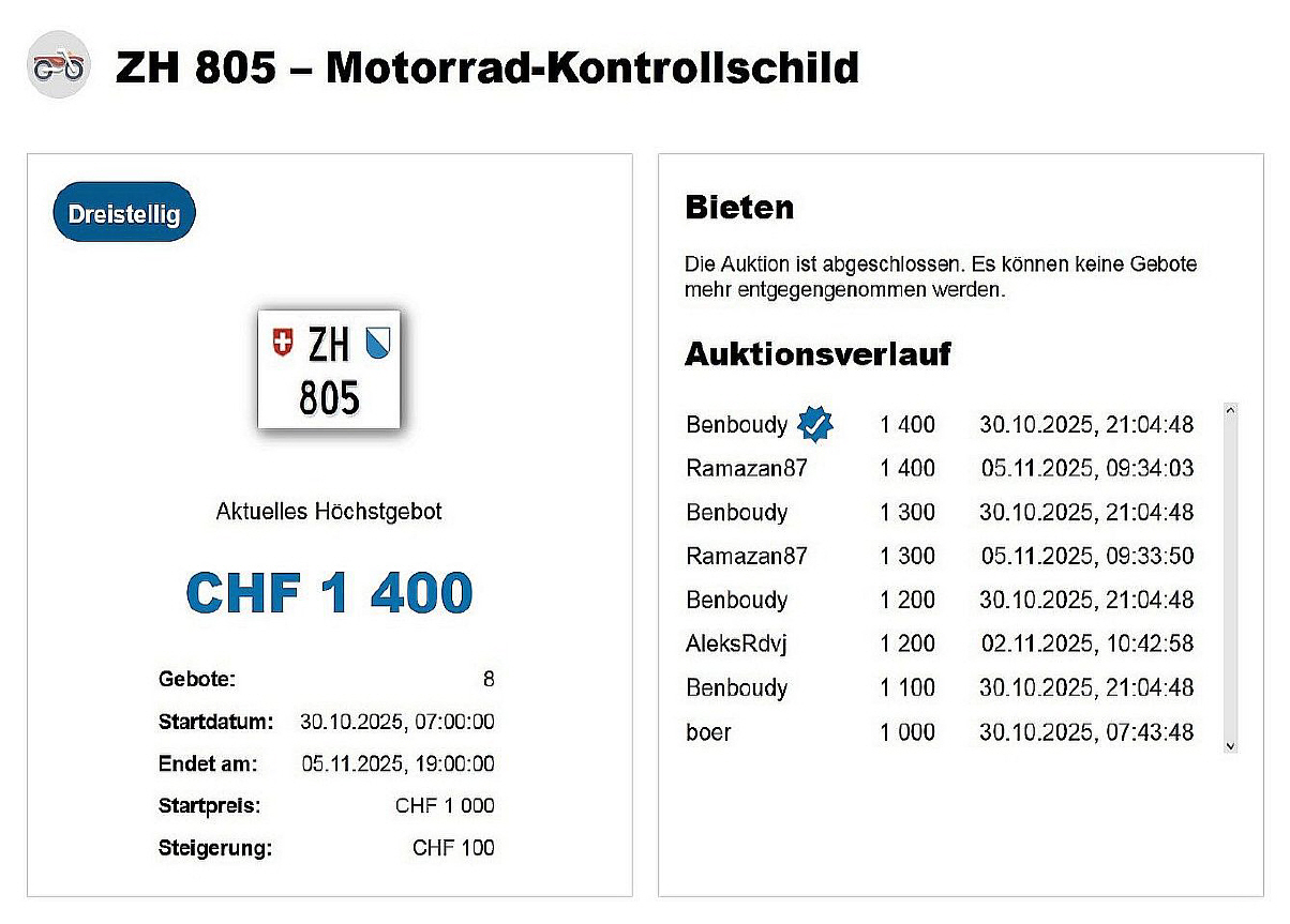 Am 05.11.2025 wurde im Kanton Zürich das nächste 3-stellige TÖFF-Nummernschild ausgegeben - in der Auktion ging es zum äusserst tiefen Preis von nur Fr. 1400.- weg! Verfolge den Verlauf vom «ZH 805