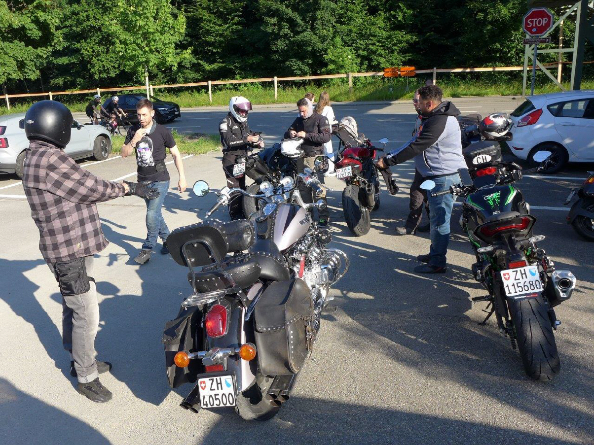 Seit dem April fahren die «Sunset-Riders» regelmässig am Donnerstag aus. Ab Dienstag wird jeweils in einem Chat eingeladen, Treffpunkt ist oft bei der COOP-Tankstelle in Brüttisellen oder, wie an diesem Donnerstag, bei der Passarelle in Uitikon-Waldegg. Es sah aus wie in alten Zeiten: Knapp ein Dutzend Motorräder standen bereit, darunter auch «Stürmi», der damals einer meiner Tourguides war.