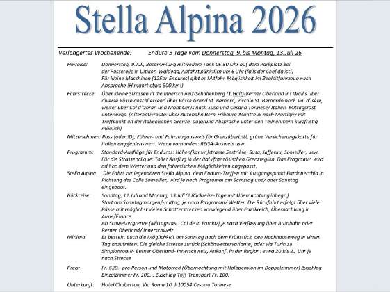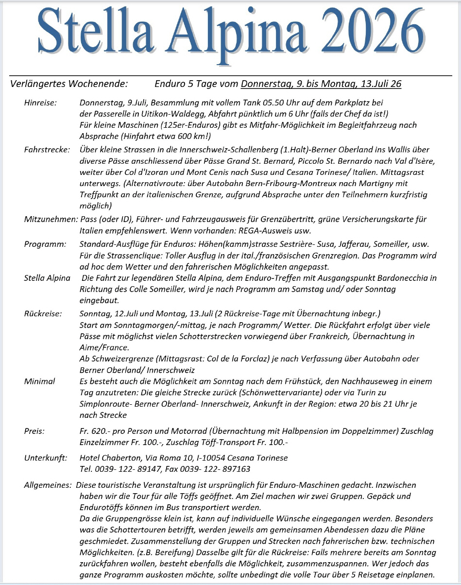 Die alternative Variante der «Stella» ist nun eine 5-tägige Töff-Tour anlässlich der Stella-Alpina vom DO, 7.Juli bis MO, 11.Juli: Diese Ausfahrt kann mit jeder Strassen-Enduro oder -Maschine gemacht werden, es besteht die Möglichkeit das Gepäck im Begleitfahrzeug transportieren zu lassen. Der HiAce-Bus dient sowohl als Gepäck-Fahrzeug wie auch als Notfall-Fahrzeug für gestrandete Fahrer(innen) oder Maschinen ... Die Kosten belaufen sich pro Person auf Fr. 550.-, Einzelzimmerzuschlag Fr. 100.- Theoretisch wäre eine Rückkehr auch bereits am Sonntag, 10.Juli möglich, wer diese Tour aber voll auskosten möchte, sollte unbedingt die 2tägige Rückreise mitmachen!